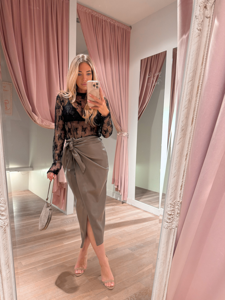 VEGAN LEATHER WRAP SKIRT – KHAKI
